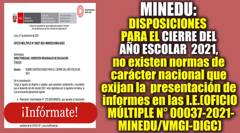 MINEDU: Estás son las DISPOSICIONES PARA EL CIERRE DEL AÑO ESCOLAR 2021, no existen normas de carácter nacional que exijan la presentación de informes en las I.E.(Vea aquí el OFICIO MÚLTIPLE N° 00037-2021-MINEDU/VMGI-DIGC)