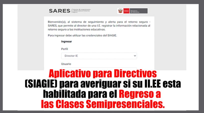 Bienvenido(a), al sistema de seguimiento y alerta para el retorno seguro – SARES, que permite al director de una I.E. registrar la información relacionada al retorno seguro a las instituciones educativas.