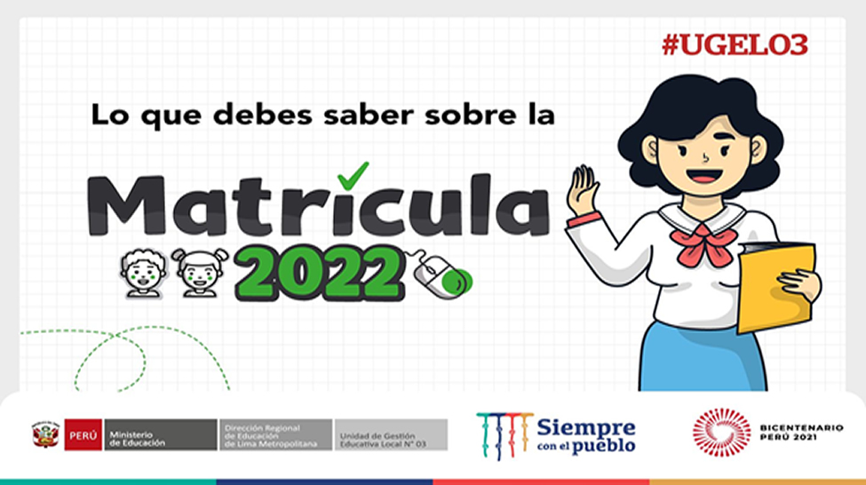 Puede ser un dibujo animado de una o varias personas y texto que dice "#UGEL03 Lo que debes saber sobre la Matricula 2022 PERU Ministerio de Educación Dirección Regional Metropolita Unidad Gestión Educativa ocal 3 Siempre con pueblo BICENTENARIO PERU 2021"              Puede ser una imagen de texto que dice "Matricula 瘦 2022 #UGEL03 Vacantes para primer ingreso La ronda 1 de solicitud de vacantes culminó el 26 de diciembre y la ronda 2 iniciará el 17 de enero con las II. ΕΕ. que aún cuentan con vacantes disponibles para inicial 3 años, 1.° de primaria y 1.° de secundaria. PERÚ inisterio Educación DirecciónRegiona deLimaMetropolitana Siempre con pueblo BICENTENARIO PERÚ"