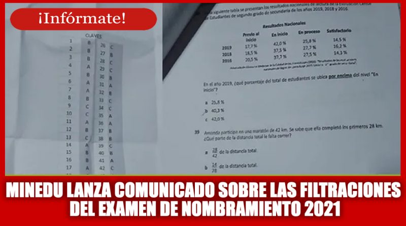 ActualidadDocentesNombramiento DocenteNOTICIAS 18 noviembre, 2021 Somos Docentes MINEDU: Lanza comunicado sobre la filtración del examen de nombramiento 2021 [Mas información aquí] Read More