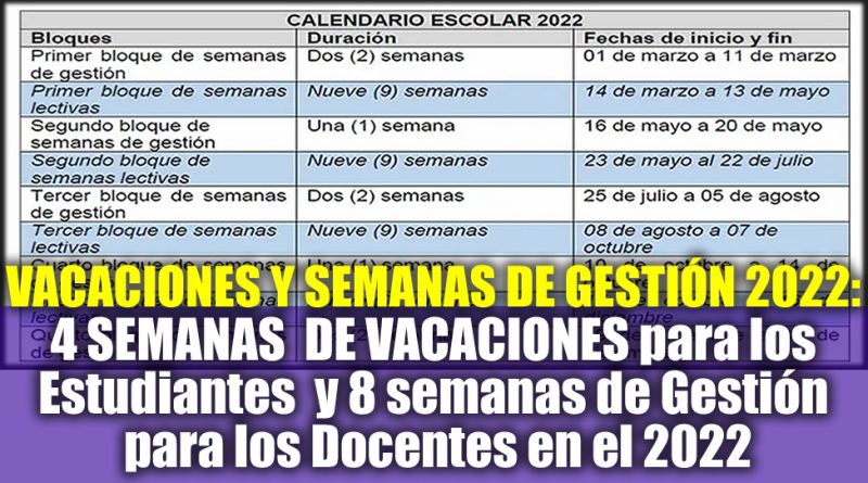 ActualidadDocentesNormativaNOTICIAS 2 enero, 2022 Somos Docentes VACACIONES Y SEMANAS DE GESTIÓN 2022: 4 SEMANAS DE VACACIONES para los Estudiantes y 8 semanas de Gestión para los Docentes en el 2022 (RM N° 531-2021-MINEDU) Read More