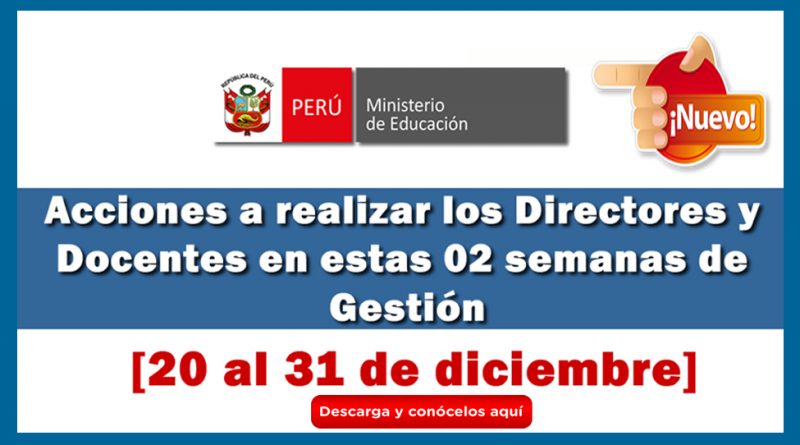 ActualidadDocentesDocumentos para docentesEducación InicialEducación PrimariaEducación SecundariaFormatosNormativa 20 diciembre, 2021 Somos Docentes ¡Atención! Acciones a realizar los Directores y Docentes en estas 02 semanas de Gestión. [20 al viernes 31 de diciembre][conócelos aquí] Read More